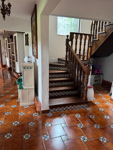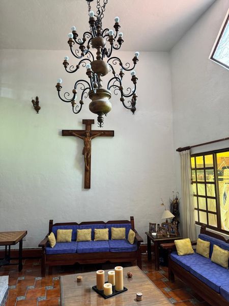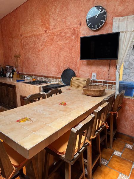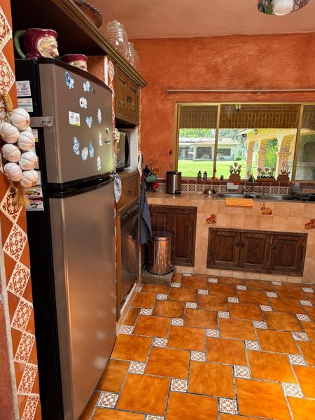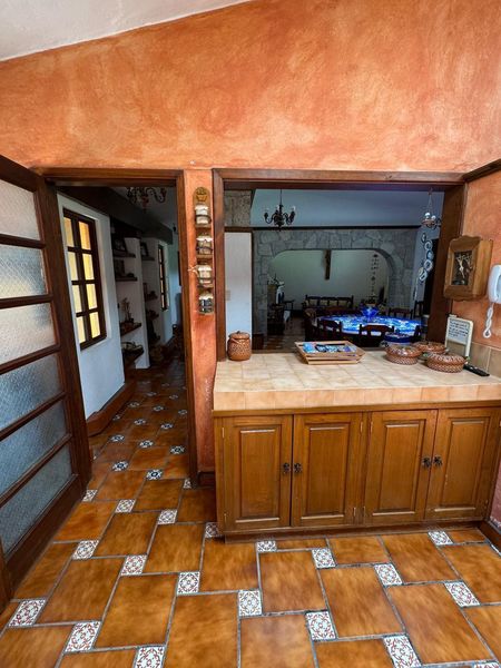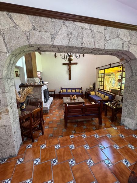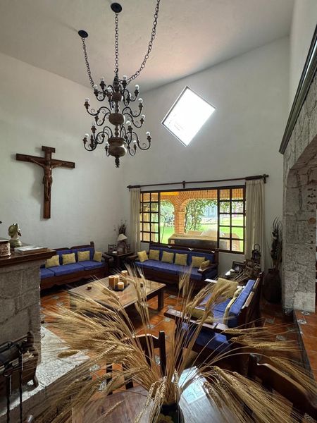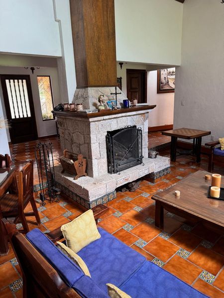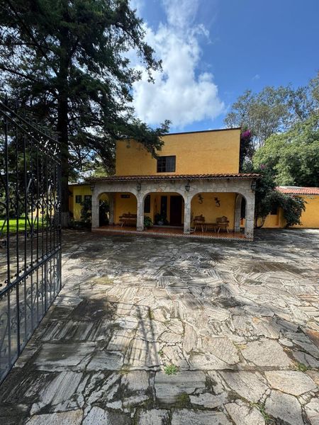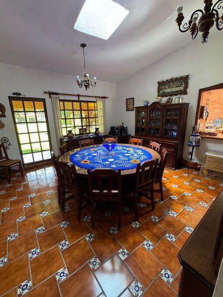 La casa principal cuenta con área de sala, comedor, cocina, sala para tv, cuatro recámaras, cuatro baños completos, terraza con amplio jardín, patio de servicio, cochera para 6 autos, huerto con árboles frutales.
