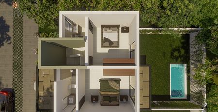 Prototipo de vivienda de 2 niveles, con espacio para estacionar 2 vehículos, sala-comedor-cocina, sanitario, 1 recámara con espacio para clóset y su propio baño completo, en planta baja. 2 recámaras con espacio para clóset y baño completo cada una, en planta alta.