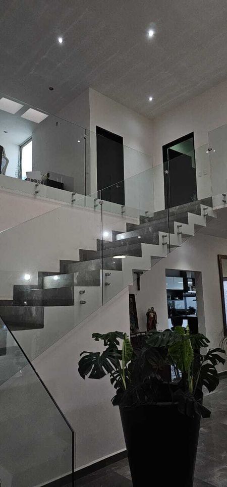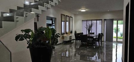 Cochera para 3 autos, amplio recibidor, corredor por ambos lados de la casa, amplio recibidor con baño completo de visitas, recámara en planta baja puede ser usada también como oficina, Amplia Sala y Comedor con vista hacia el jardín, Cocina integral con isla de Granito para 8 sillas, puerta lateral que comunica al jardín, cuarto de lavandería, cuarto de servicio, bodeguita,