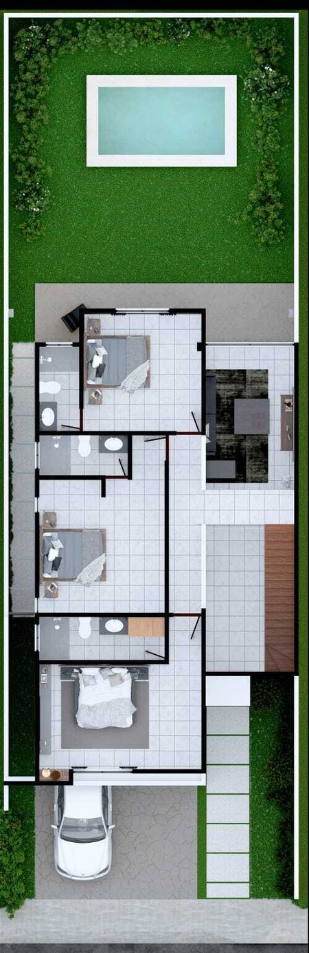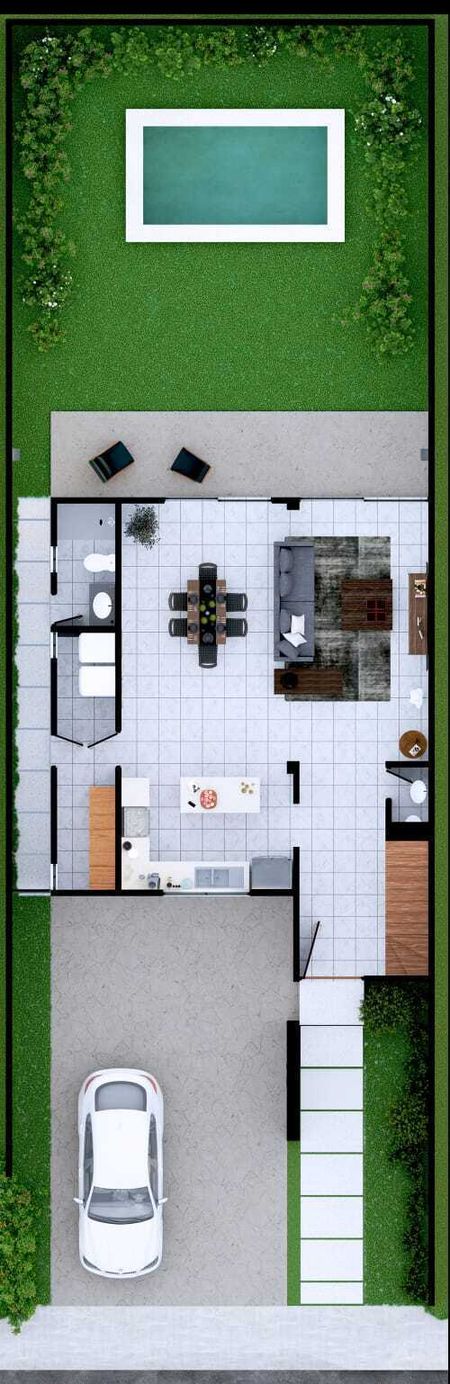 -PLANTA BAJA: Garaje techado para 2 vehículos | Área de jardín frontal | Pasillo de servicio | Sala y comedor