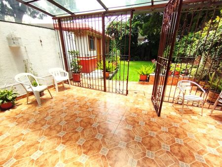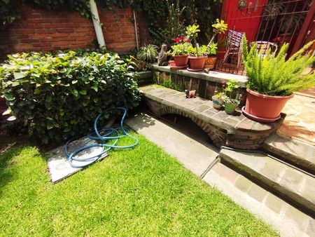 Planta baja: Sala. Comedor. Baño de visitas. Cocina con alacena y escalera de servicio. Terraza. Extraordinario jardín de más de 100 m2, en donde se encuentra una habitación independiente con recámara, baño completo y clóset.