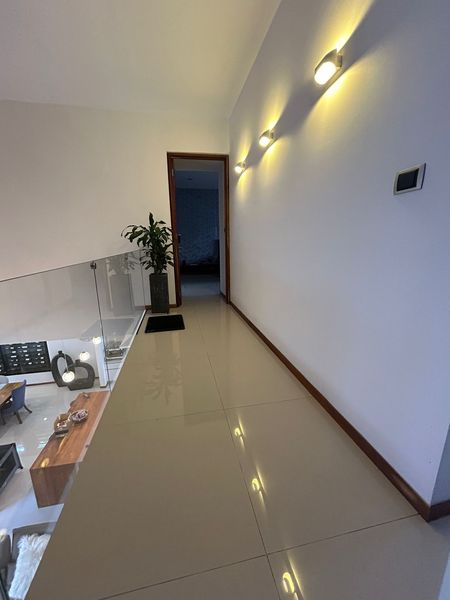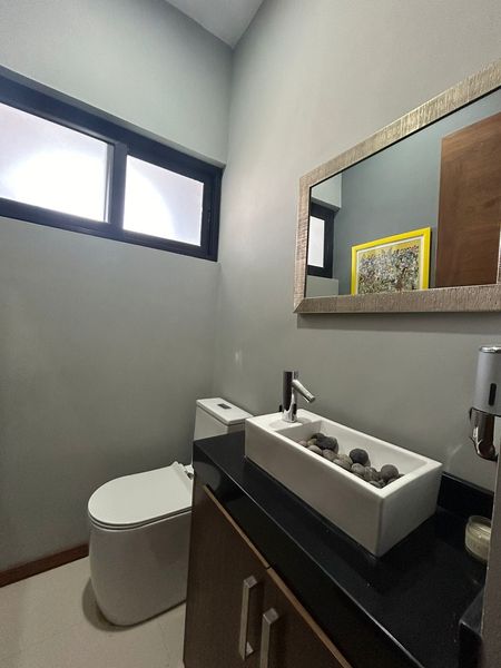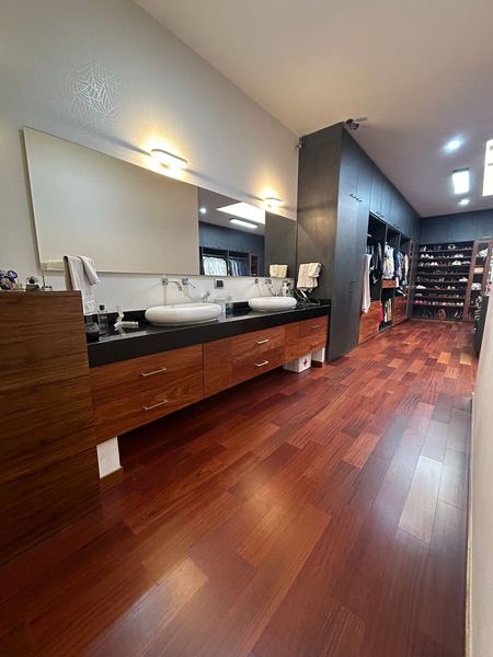 PA Escalera flotante de madera salam maciza y barandal de cristal templado, pasillo de distribución entre habitaciones con vista a la sala y su doble altura 3 habitaciones secundarias con baño completo y vestidor para camas King, habitación principal con cama de posiciones eléctrica , salita de tv, vestidor enorme con iluminación natural , espacios para guardar todos los accesorios , baño completo con acabados luxury , wc japones climatizado, adecuaciones para colocar vapor.