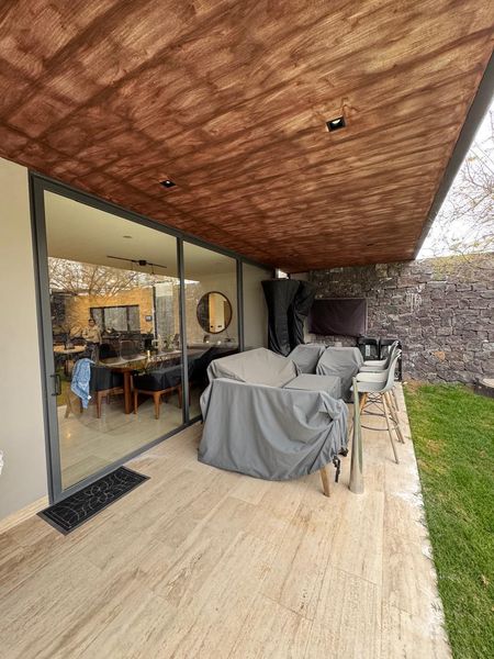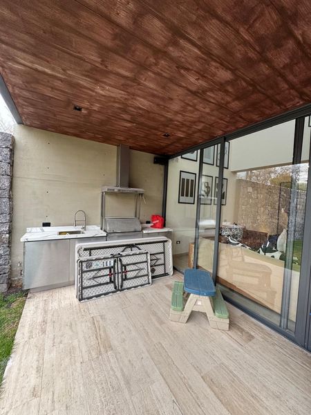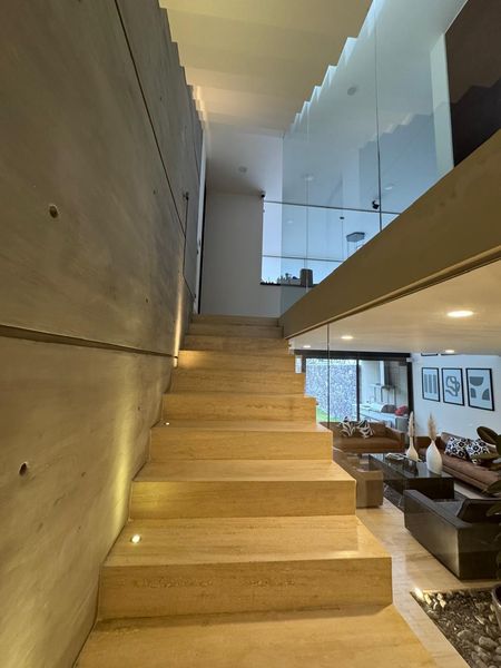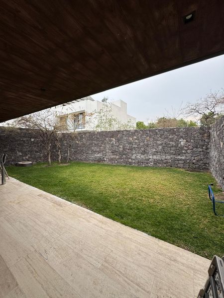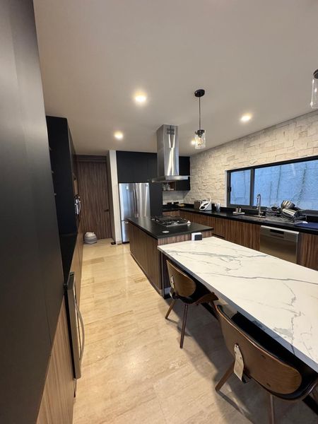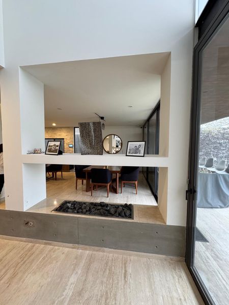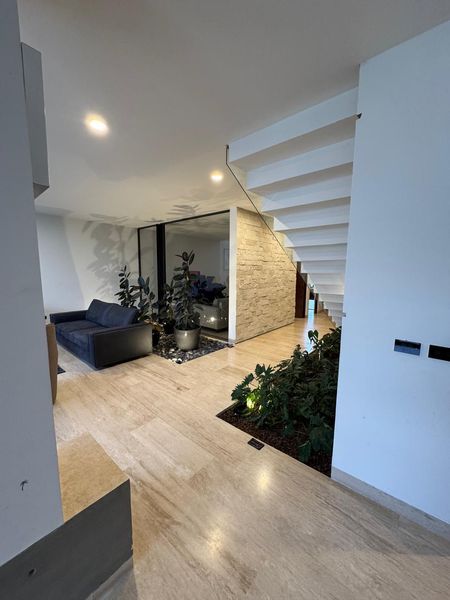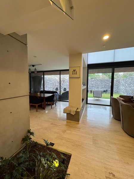 Estacionamiento para 3 autos con estación de cargador eléctrico, vestíbulo con closet de blancos y baño completo, despacho con opción a habitación en PB, sala y comedor con chimenea y vista al jardín, cocina abierta con isla, área de lavado con bodega, pasillo lateral.