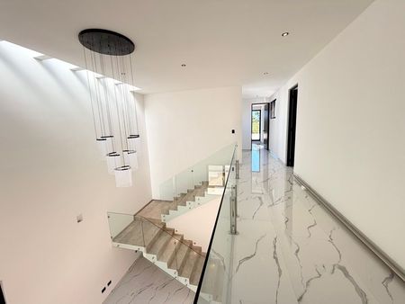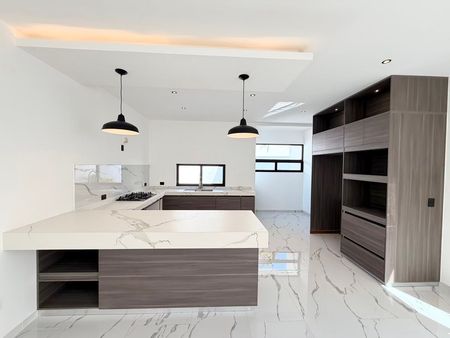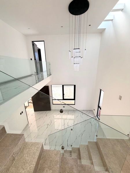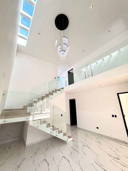 Carpintería en Cocina y Closets, 4 Aires Acondicionados, Cristal Templado y Espejo en Baños, Persianas, Escalera Forrada en Mármol, Barandales de Cristal Templado, Lámparas Decorativas en Sala y Cocina, Tanque de Gas Estacionario, 10 Páneles Solares, Estufa Empotrable de 6 Quemadores y Horno.