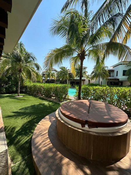Zona de albercas con regaderas, vestidor, cambiador, jacuzzi, baños y spa.