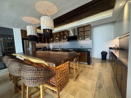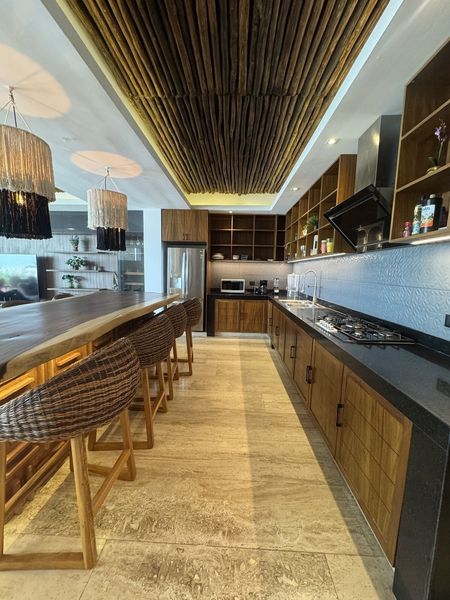 Cocina equipada con parota y granito, campana, parrilla, refrigerador, microondas y demás electrodomésticos