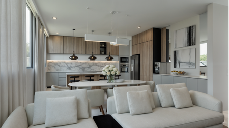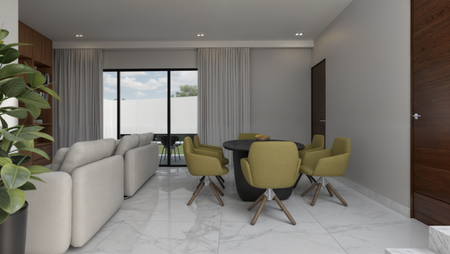 En planta a nivel de calle tienes 1 medio baño de visitas, un área de cocina abierta con despensa walk-in, comedor, y sala. Ademas de closet de blancos con sink.