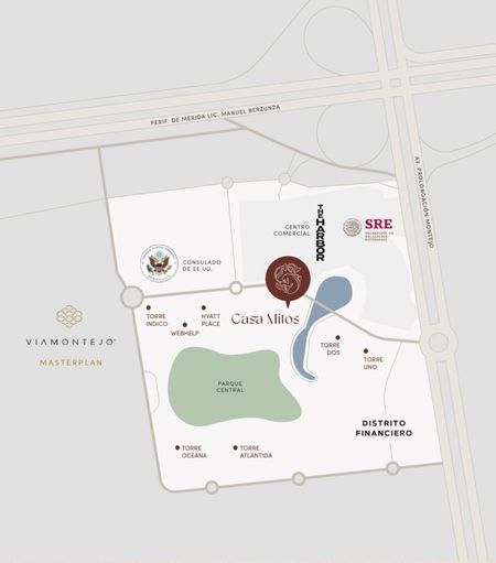 Casa Mitos es una torre residencial al corazón de Vía Montejo, un Masterplan con espacios para compartir, y que conecten a las personas entre sí y con los esenciales para su día a día.