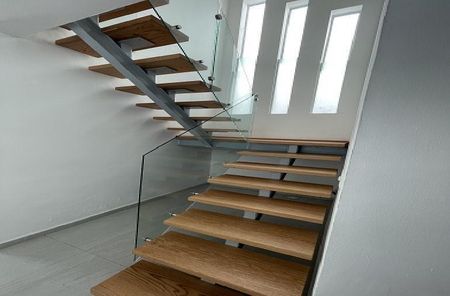 Escalera de madera con barandal de cristal templado y puerta de seguridad