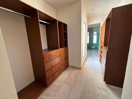 Recámara principal con walking closet con madera de Tzalam, ventilador de techo y con baño completo con doble lavabo ,con cancel de vidrio templado y balcón