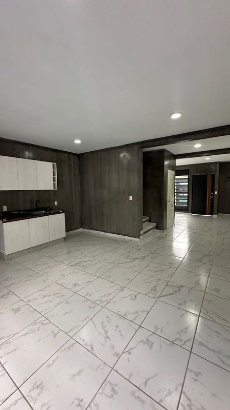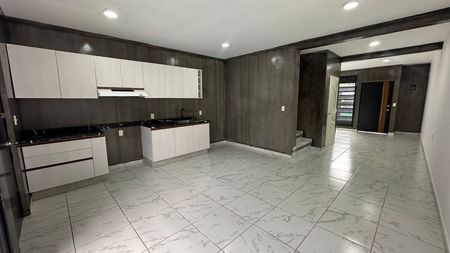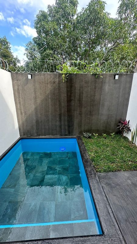 DISTRIBUCIÓN PLANTA BAJA: Portón de herrería cerrado para darte mas privacidad y seguridad, estacionamiento para dos vehículos y Jardín frontal, puerta principal con chapa de seguridad, ventana corrediza de piso a techo para ventilar mas tus espacios, herrería fija, espacio para colocar recibidor y mesa de llaves, medio baño para visitas, espacio abajo de las escaleras ideal para guardado, sala y comedor amplios, cocina integral, incluye campana, barra y tarja, puerta corrediza con cristal y aluminio reforzado, puerta de acceso al jardín, alberca con las siguientes medidas 4.5 metros de ancho x3.5 metros de largo x1.5 metros de profundidad. Lámparas de jardín, alambrado de seguridad en la barda para brindar más seguridad. En Planta alta cuenta con instalación para colocar centro de lavado, incluye lavadero de granito.