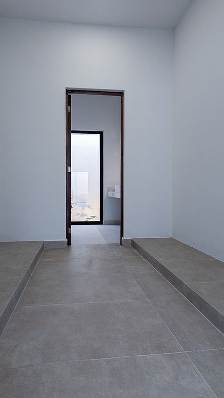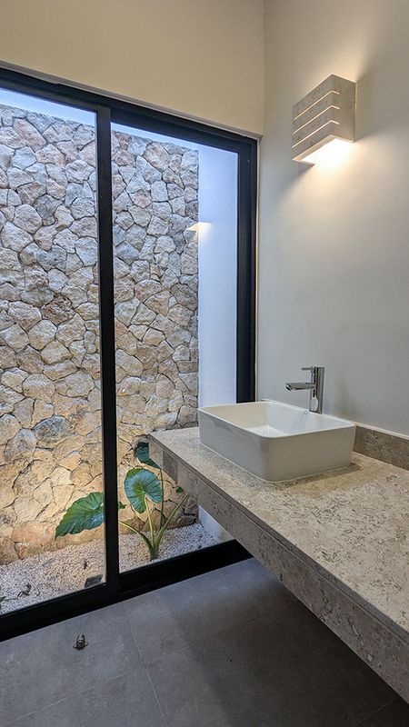 -Cochera para 2 autos sin techar, con fachada de muros de piedra y acabado chukum,