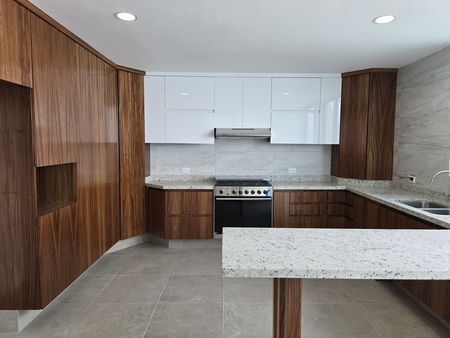 ⁃ Cocina integral muy amplia, estufa, instalación para, lavavajillas y refrigerador con isleta.