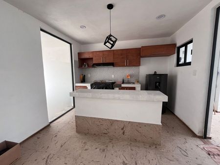 -Cocina con gabinetes de madera, barra, incluye estufa y campana.