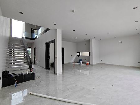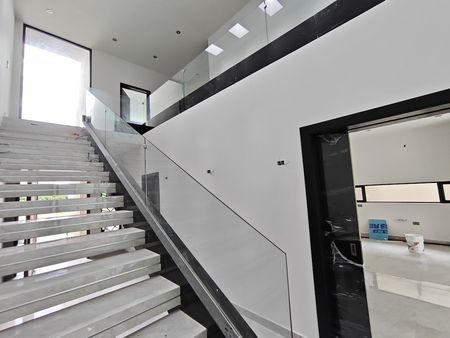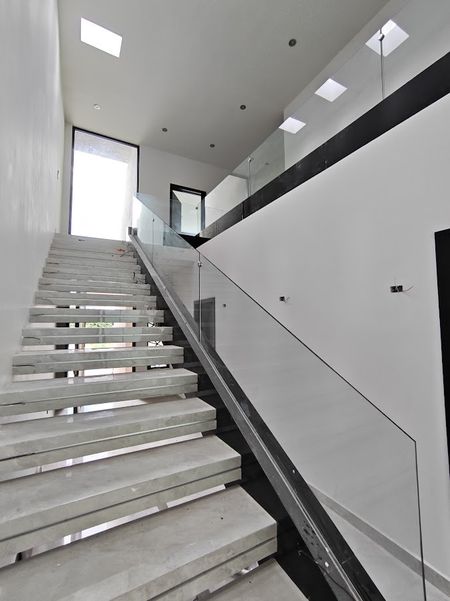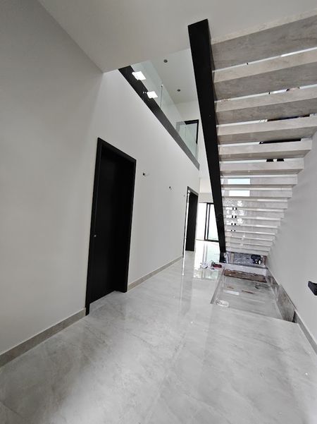 -Recibidor, medio baño para visitas, escalera con luz LED, espacio abierto de sala-comedor-cocina y jardín
