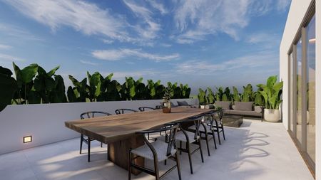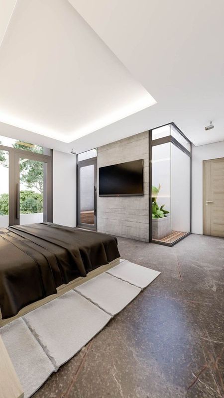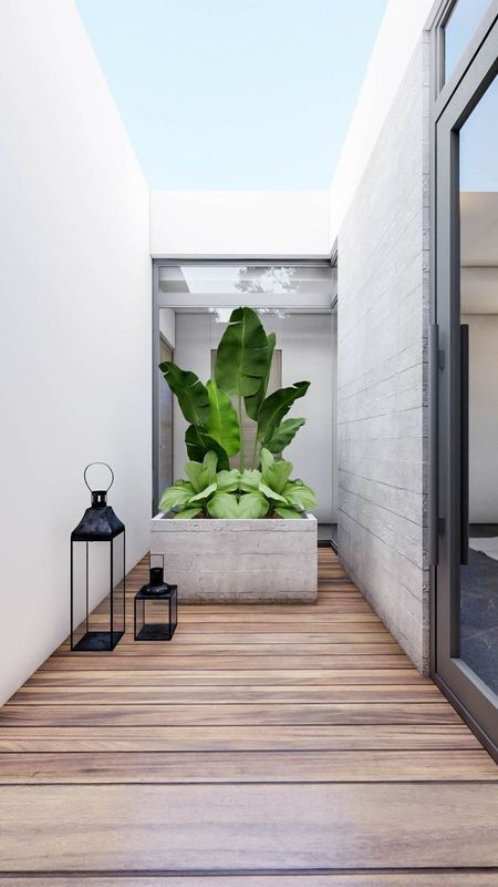 Cochera para 3 autos, recibidor, medio baño de visitas, jardín interior, recámara con baño completo y vestidor.