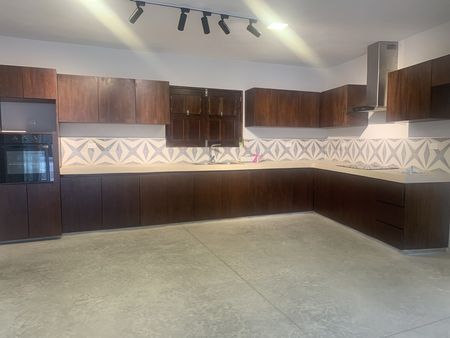 Cocina abierta totalmente vestida con gavetas de madera inferiores y superiores