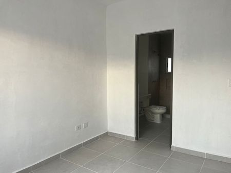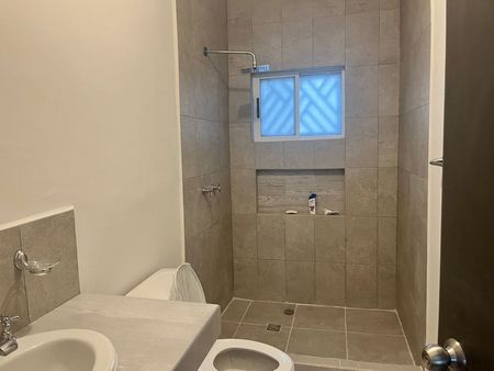 En planta baja:sala comedor, cocina, espacio para lavandería interior, medio baño, recámara con baño completo y cochera techada para 2 autos..