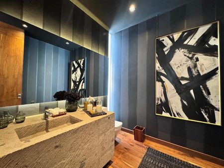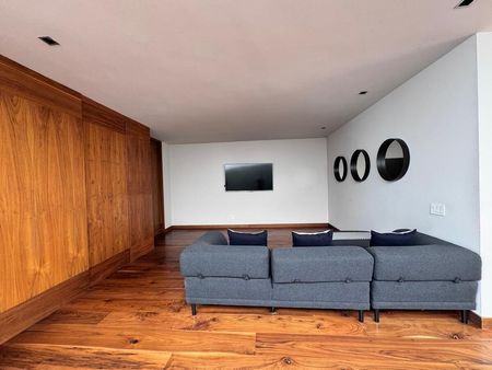 Cuenta con tres amplias recámaras, cada una con baño completo y vestidor, además de sala de televisión. Y área de lavado.