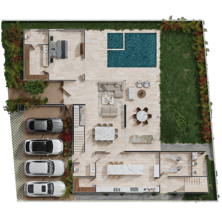 Este modelo se caracteriza por su armoniosa distribución, además la opción de un estudio en planta baja que se puede convertir en una quinta habitación.