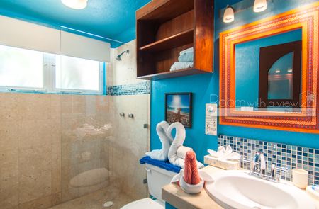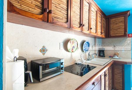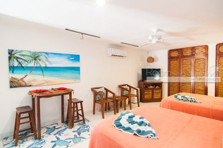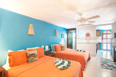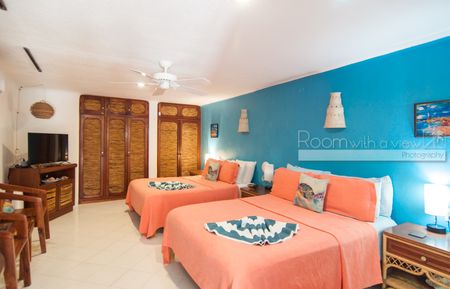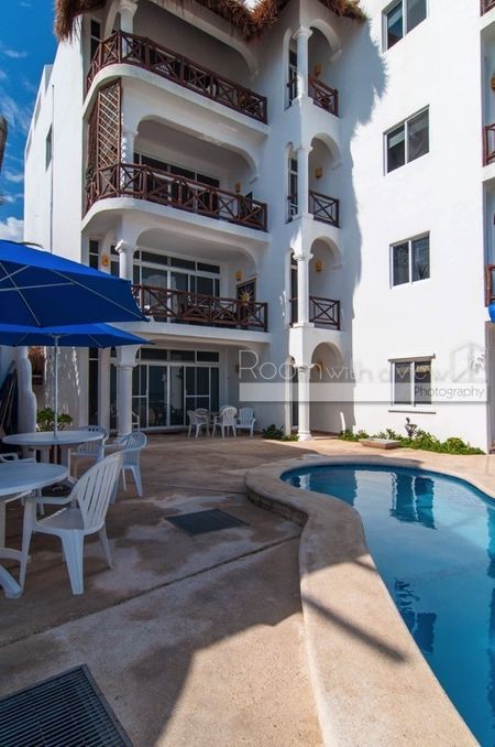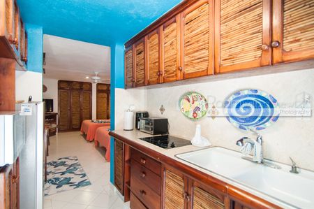 El estudio tipo cuenta con cocina equipada y una amplia área para sala y recámara, creando un cómodo espacio para vacacionar o estancias prolongadas. Playa Caribe ofrece amenidades tipo resort, que incluyen alberca, servicio diario de limpieza, internet de alta velocidad, toallas para la alberca y estacionamiento para cada unidad. El edificio también cuenta con un sistema de ósmosis inversa que provee agua potable limpia directamente del grifo. Para mayor comodidad, una administración de renta en el sitio se encarga de las reservaciones y servicios para huéspedes.