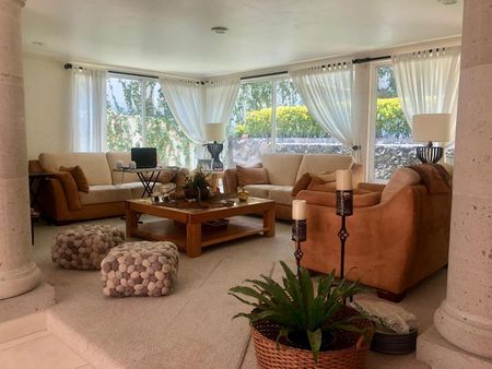 Acomodando sus espacios para contemplar esta Bella zona boscosa. Sembrada de tal manera que domina la sala principal tiene vista a un encantador jardín en escuadra (L). Además de, una gran meseta ligeramente elevada, completamente plana para disfrutar y aprovecharla al máximo. La sala está dispuesta al centro de la casa. Su comedor, construye un ambiente elegante que une a la familia. Cocina integral equipada, bien planeada encanta por su funcionalidad. Cuenta con barra, isla, despensa y alacena. En forma contigua, encantador antecomedor con vistas a jardines frontales y a panorámica boscosa de la zona.