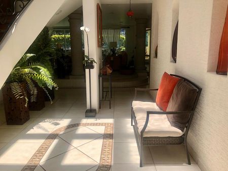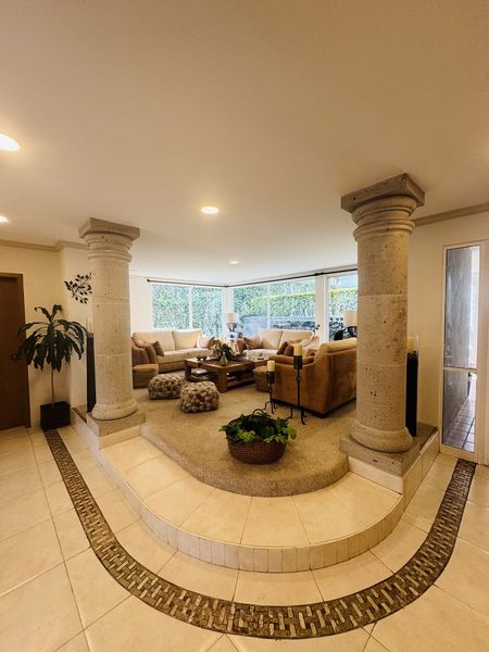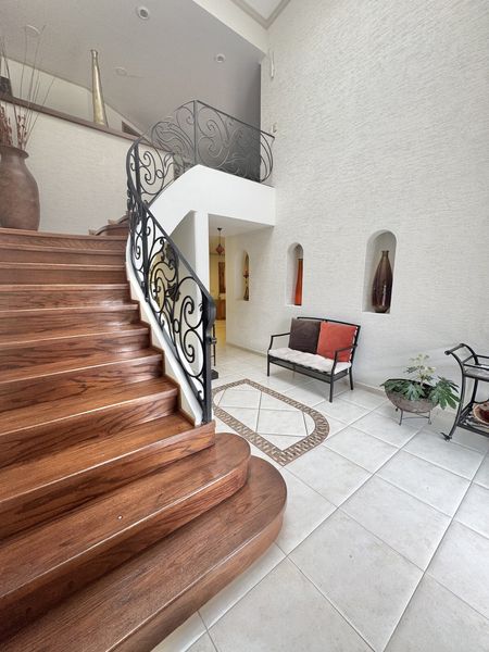 Al abrir la puerta principal, te recibe un gran hall de doble altura con una preciosa escalera y un ambiente bañado de luz natural. Coronado por una lámpara que viste el lugar. Al entrar ves la sala como punto focal hacia el jardín.