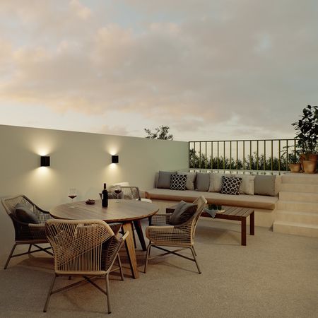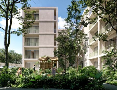 Los espacios al aire libre este proyecto, adornados con una vegetación que crece vigorosamente, constituyen el