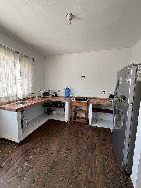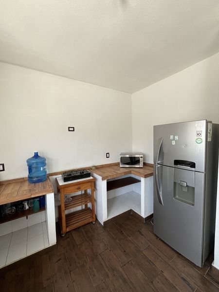 - Mesa de centro, cocina, refrigerador, microondas y algunos platos.