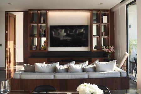 - Recamara principal equipada con mueble de tv, tv de 75 pulgadas, cabecera, buros, cama king size, closet vestidor y baño con doble lavabo.