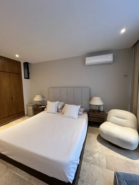 El departamento cuenta con acabados de lujo en todas sus áreas y se entrega completamente amueblado y equipado .