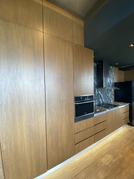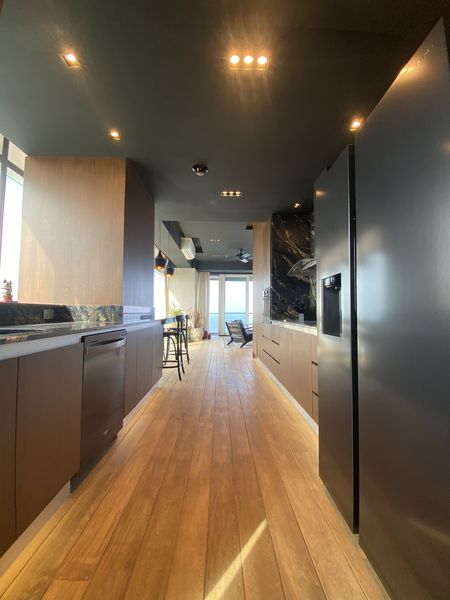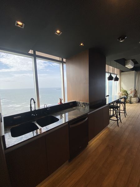 - Cocina integral con vista al mar equipada con barra de granito, parrilla, campana, torre de hornos, doble tarja y lavavajillas.