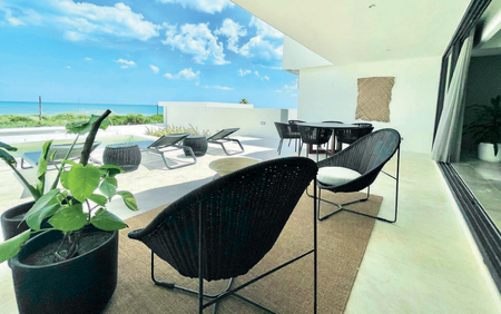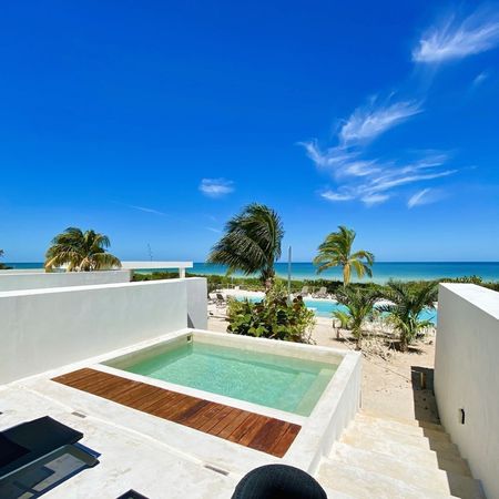Departamento de lujo con vista al mar PARA ENTREGA INMEDIATA, últimos dos modelos de dos niveles disponibles (Tipo A y Tipo B), en planta baja que da acceso directo a las albercas del complejo y a la gran playa en TELCHAC PUERTO, justo a un lado de la Marina Kinuh.