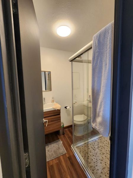 Baño completo: Remodelado, con cancel de cristal templado y muebles modernos.