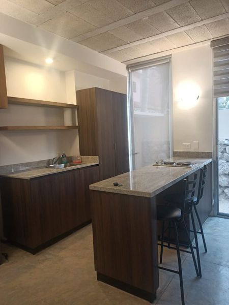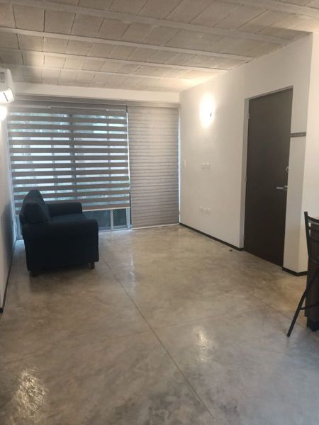 Es de 1 recamara, 1 baño con closette vestidor, se encuentra en planta baja y tiene un pequeño espacio para jardín. Cuenta con balcón.