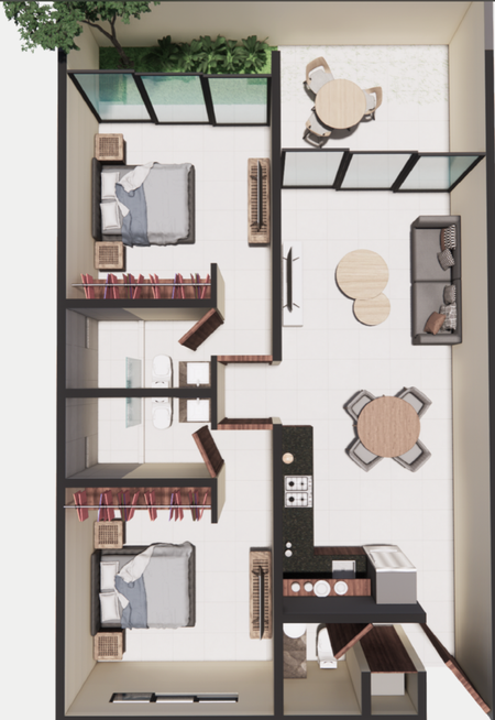 En total son 6 formatos de departamentos, en esta publicación ofrecemos un departamento doble de planta baja que ofrecerá los siguiente espacios: