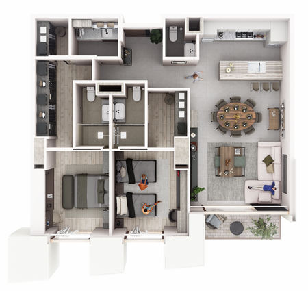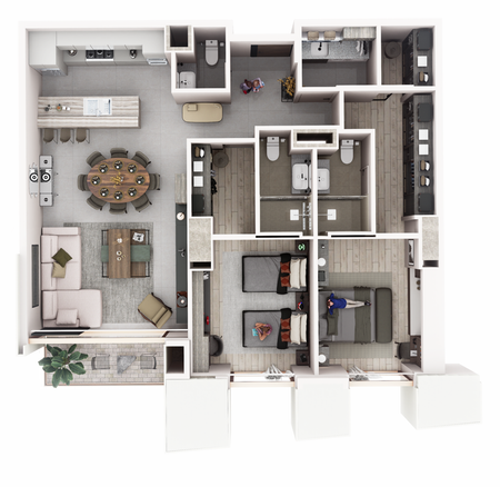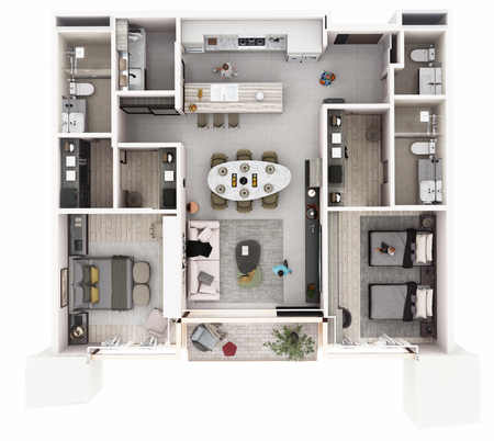 Sala, comedor, cocina lineal, barra desayunadora, balcón, área de lavado, medio baño para el área social, recámara principal con clóset vestidor y baño, recámara secundaria con baño propio y clóset vestidor.