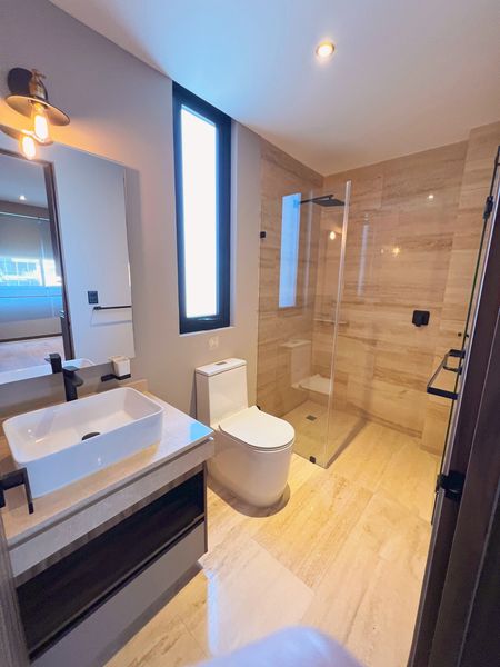 Habitación principal: Cuenta con walk-in closet, baño completo con cancelería de vidrio templado y doble lavabo.