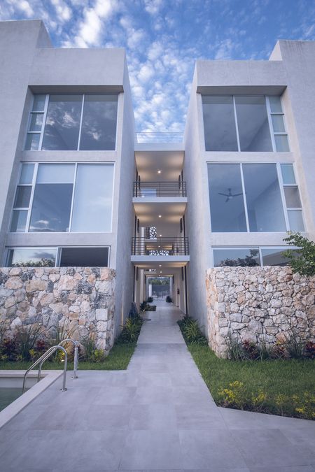 El complejo consta de 4 torres independientes, con un solo departamento por nivel, rodeadas de hermosas áreas verdes que ofrecen una privacidad y tranquilidad excepcionales. La arquitectura minimalista se combina con elementos tradicionales de la región, creando un diseño que es tanto estético como funcional. La zona social incluye una piscina integrada en una terraza y una casa club, todo rodeado de jardines.