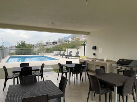 Equipado con cocina, estufa, campana, refrigerador, closets, canceles, 4 climas, persianas, lavadora, secadora y boiler