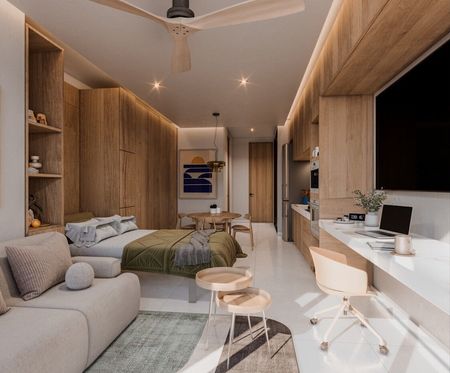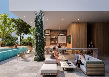 AMENIDADES: Área lounge con barra, terraza grill, asoleadero, alberca, gimnasio mixto equipado, canchas de pickle ball, terraza yoga, jardín para mascotas, coworking center.