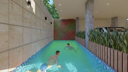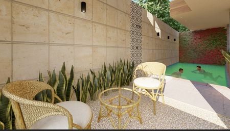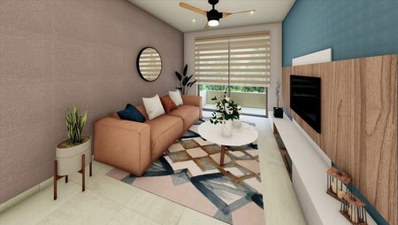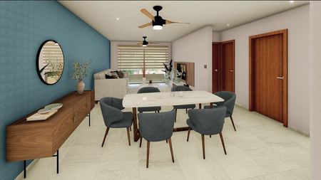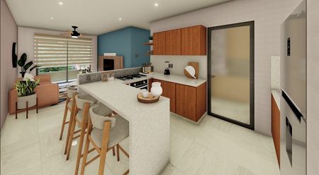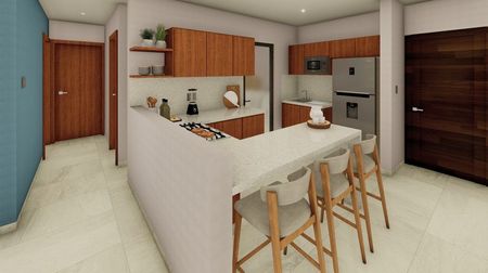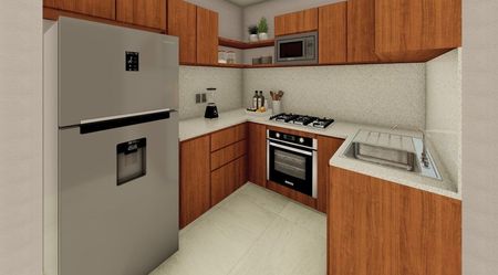 Cuenta con 2 recámaras con clósets, 2 baños completos, sala comedor, cocina integral equipada con parrilla, horno, campana, cuarto de lavado y garage techado para 2 autos.