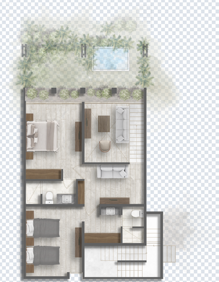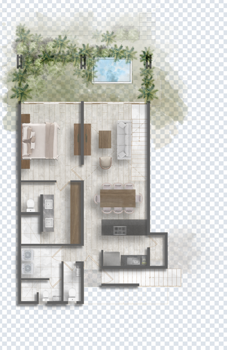 Departamento en venta con especulares amenidades, 3 albercas, cancha de pádel, gimnasio, centro de negocios, cuarto de juegos, integrando exitosamente jardines, espejos de agua, piscinas, casa de árbol y área habitable.