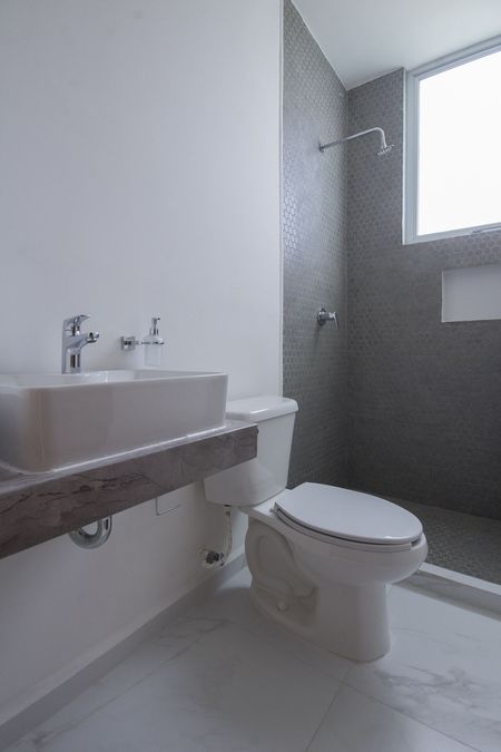 • Accesorios de baño cromados, lavabo mediano de sobre cubierta con llaves, wc de porcelana, mueble de madera para lavabo