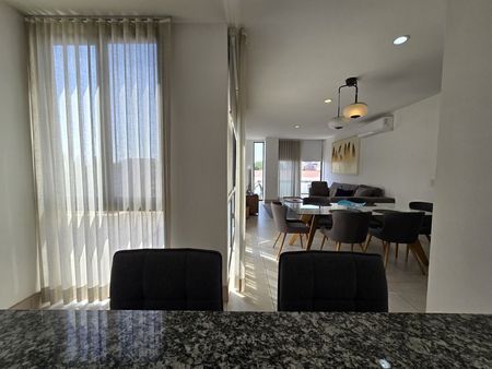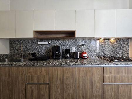 La cocina es amplia, con barra de granito y equipada con refrigerador, parrilla, horno, cafetera, licuadora y utensilios. Los baños cuentan con acabados de cristal templado y mármol, y el área de servicio incluye un centro de lavado.