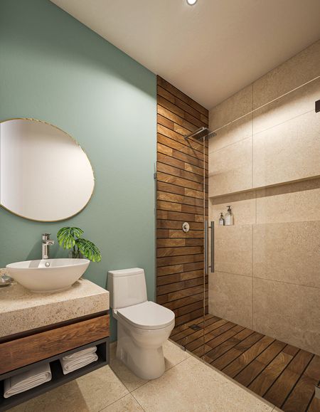 - Fachada con pasta tipo chukum y cerámica tipo madera.