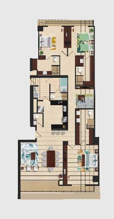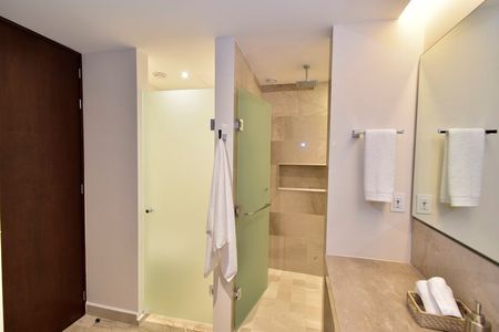 Este departamento se ubica en el nivel 8, cuenta con 3 amplias recámaras, cada una con vestidor, baño completo y terraza, sala - comedor, cuarto de servicio con baño, área de lavado, medio baño de visitas, cocina y sala de tv.