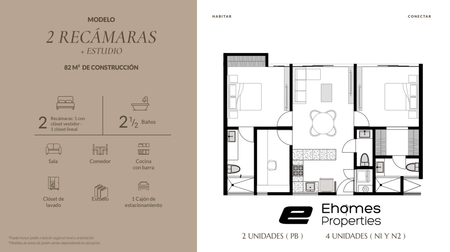 2 recámaras + estudio (flex) 81m2 desde $2,750,000 - $2,850,000 MN *Publicado
