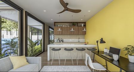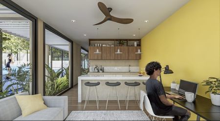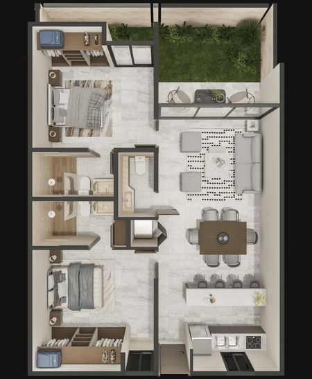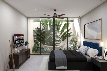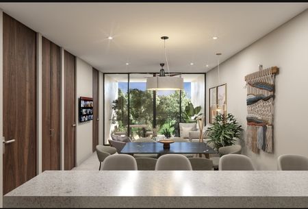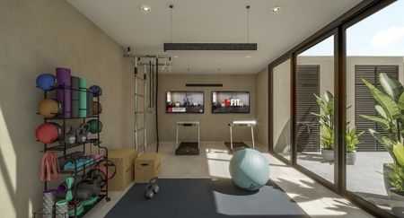 Equipamiento según modelo: Aires acondicionados sin instalar, calentador eléctrico, parrilla eléctrica, refrigerador, cama matrimonial, cabecera, burós, tv de 50" instalada, cortinas blackout en recámara y sala, microondas, sofá de 2 lugares para sala, mesa de centro para sala, clósets semivestidos, gaveteros inferiores en cocina, fijo de cristal en baños.
