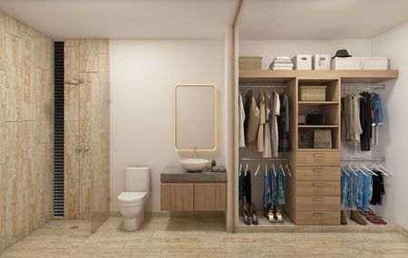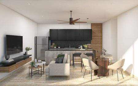 Este modelo de departamento de una planta cuenta con cocina con isla para desayunar, comedor y sala corrida con vista hacia la terraza techada y medio baño para visitas, cuenta con dos recámaras con clóset y baño propio.